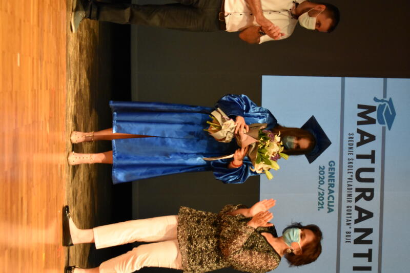 „Iako zbog pandemije koja je zadesila cijeli svijet nismo mogli otići na toliko priželjkivani maturalac o kojem smo maštali, ipak smo bili na brojnim izletima i terenskim nastavama na kojima smo upoznali naš zavičaj, ali i brojne europske prijestolnice. Školovanje ćemo pamtiti i po izuzetno susretljivim i predanim profesorima, brojnim projektima, susretima, terenskim nastavama, koji su nam omogućili izlazak iz suhoparne svakodnevice. Hvala vam što ste bili uz nas te nam pružali ruku u najtežim trenucima, podizali nas i s nama slavili naše uspjehe.“