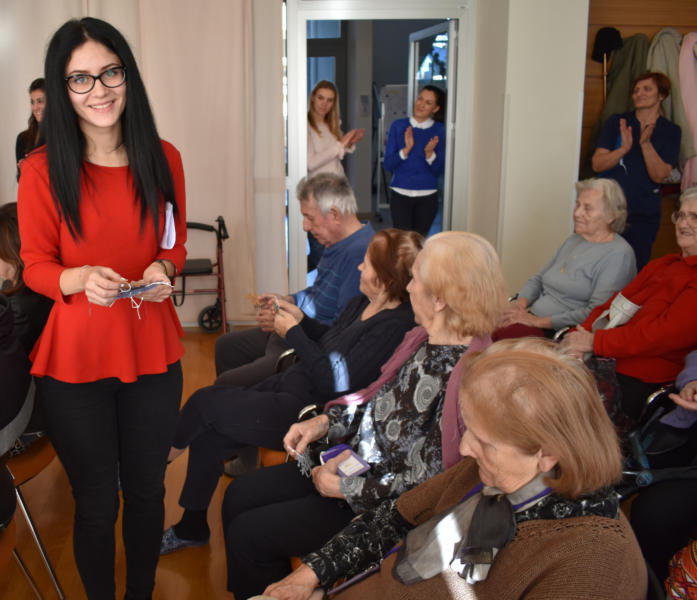 Posebnu su draž susretu udahnule učenice IV.c razreda hotelijersko-tusrističkog smjera Lara Guzić, Vanessa Šorgo i Karin Klarić koje su korisnicima doma pročitale sjećanja na božićno slavlje i blagdanske običaje koja su s njima podijelile njihove bake i to na hrvatskom jeziku te na talijanskom i buzetskom dijalektu. Iz publike su se mogli čuti komentari korisnika koji su se prepoznali u pričama i potvrdili da je u prošlosti sve bilo mnogo skromnije, a ljudima je najbitnije bilo vrijeme provedeno u zajedničkom druženju, veseleći se malim stvarima. Kao i svake godine, za naše smo drage prijatelje iz Doma pripremili i darove: ukrase za bor u obliku pahuljica koje su izradile učenice IV. C razreda. I naši su domaćini za nas pripremili darove: čokolade za učenike, i buket cvijeća za profesore.